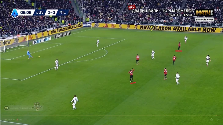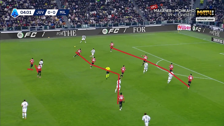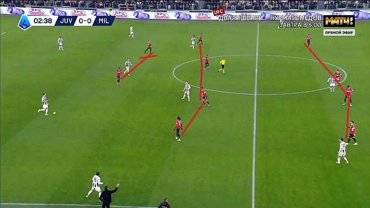 Число, игроков как видно на скрине, более чем достаточное для организации реального давления даже на защитную линию «бьянконери», однако реальным прессингом это нечто назвать у меня язык не повернется. «Кто в лес, кто по дрова» - лучшая характеристика происходящего. Леао и Муса (подчеркнуты) себе там спокойно разговаривают вообще в отрыве от игры. Рейндерс просто стоит. И лишь Беннасер и Абрахам хотя бы пытаются создать видимость прессинга и перемещений.