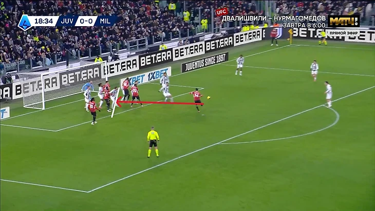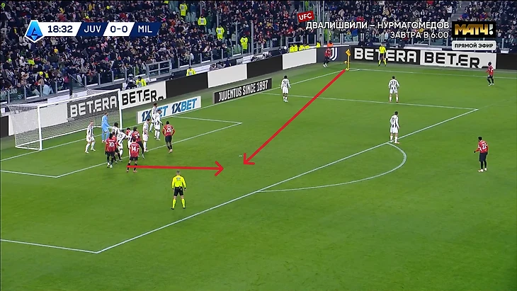 В остальном, с мячом «Милан» особо не дал никаких интересных моментов или размышлений, ведь все опасные моменты гостей в первой 45-минутке - контратаки вкупе с индивидуальными ошибками соперника (это разберем чуть позже) либо домашние заготовки на стандартах, которые в первой половине работали шикарно. Эта, например, привела ко второму самому опасному моменту «Милана» в матче: