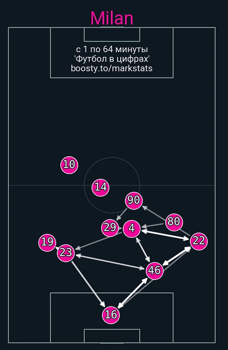 Ну и последнее про игру «Милана» без мяча - оторванность Леау от всего игры команды при обороне. Просто взгляните на карту средних позиций «россонери»: