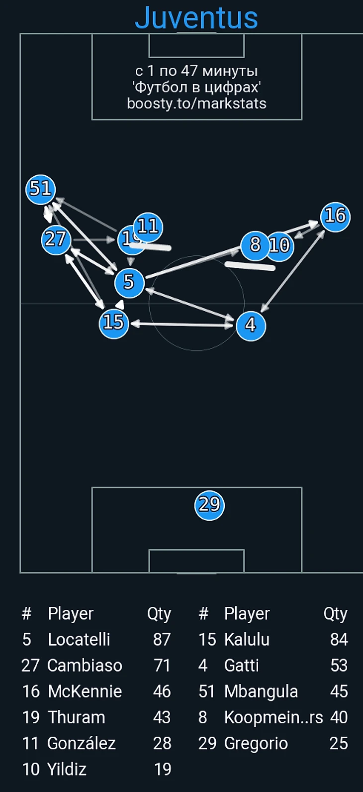 У «Ювентуса» же ситуация диаметрально противоположная, касаемо количества интересных наблюдений игры на мяче и без. Как я говорил выше, на самых первых минутах туринцы практически не рисковали, что подтверждает и статистика: за первые 20 минут у «Юве» 0 ключевых передач и лишь 2 удара по воротам, но и те, пусть и вышли опасными, но были нанесены далеко с не самых опасных позиций. Но главное, что я отметил за этот стартовый отрезок - роль Коопмейнерса Душан Влахович вновь оказался не готов к игре с первых минут, и вышел лишь на 83-й, поэтому, формально, на роль форварда вновь был поставлен Гонсалес, однако немногим меньше при игре на мяче там располагался и Коопмейнерс: