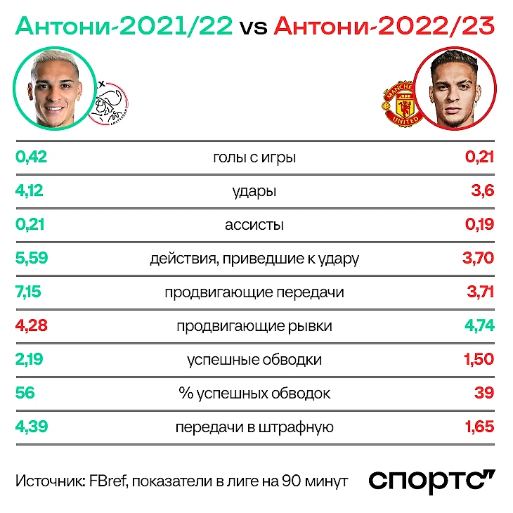 Адаптация к АПЛ сжирает хорошую статистику даже у топ-игроков, но Антони сдал колоссально. Просадку метрик видно при сравнении последнего сезона в Нидерландах (лучший в карьере) и дебютного в Англии (больше всего сыгранных минут за «Юнайтед»).
