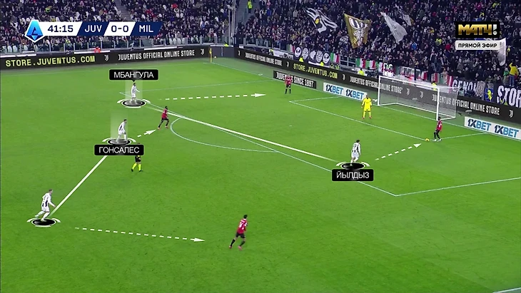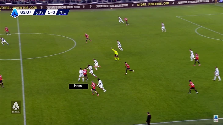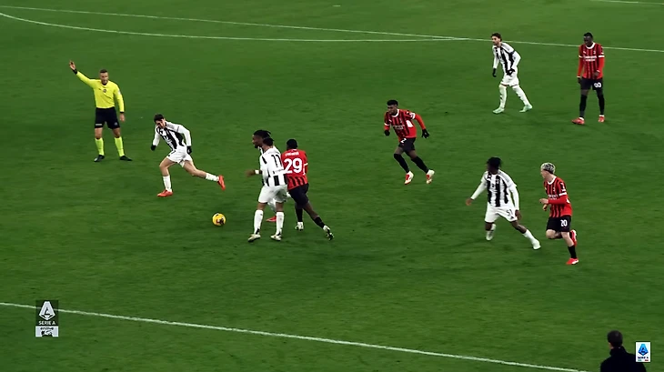 Второй гол «Юве» против «Милана» (2:0) – это неудачный пас, перехваченный Фофана, и мгновенный возврат. Француза оцепили трое туринцев сразу: Мбангула отобрал, Тюрам подхватил и ускорился по опустевшему центру.