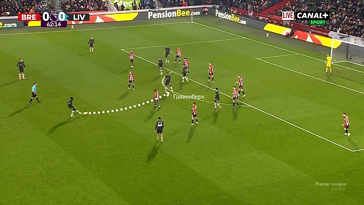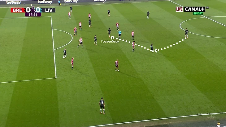 Что же придумал Арне Слот? Одна из самых яркий деталей – включения Райана Гравенберха в зону перед штрафной. Он привычно контролировал темп атак из опорной зоны, но у его роли появились новые грани.