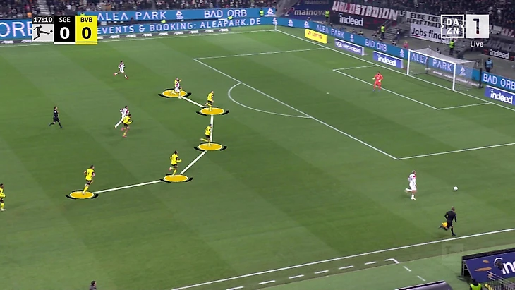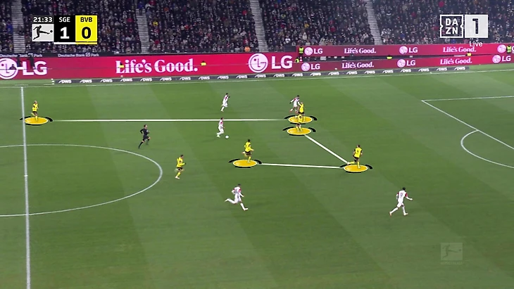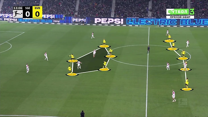 Центральные защитники «Дортмунда» (особенно Нико Шлоттербек) умудрялись выдергиваться и ломать линию, но без плотной игры против оппонента. На флангах тоже не было нужной плотности. Результатом становились вот такие коллапсы: