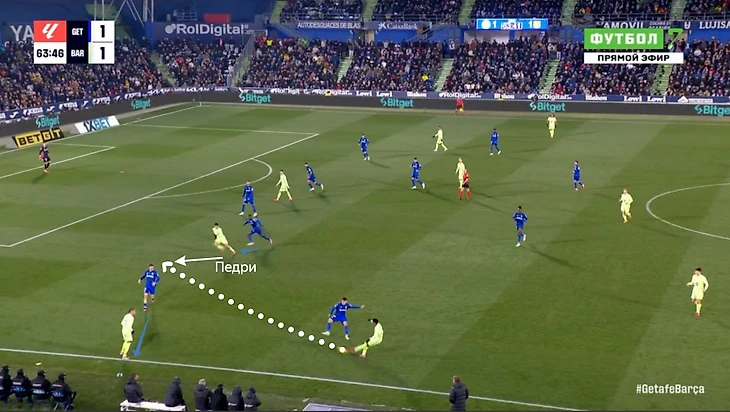 А еще активно искал пространство и внезапно возникал без опеки между линиями или на фланге. Здесь Педри увидел брешь в структуре, вытянул за собой опорника и в итоге нашел Рафинью в штрафной.