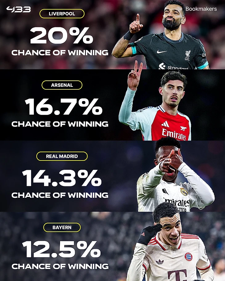 Один из крупнейших футбольных порталов «433» выложил коэффициенты букмекеров на победителя Лиги чемпионов.
