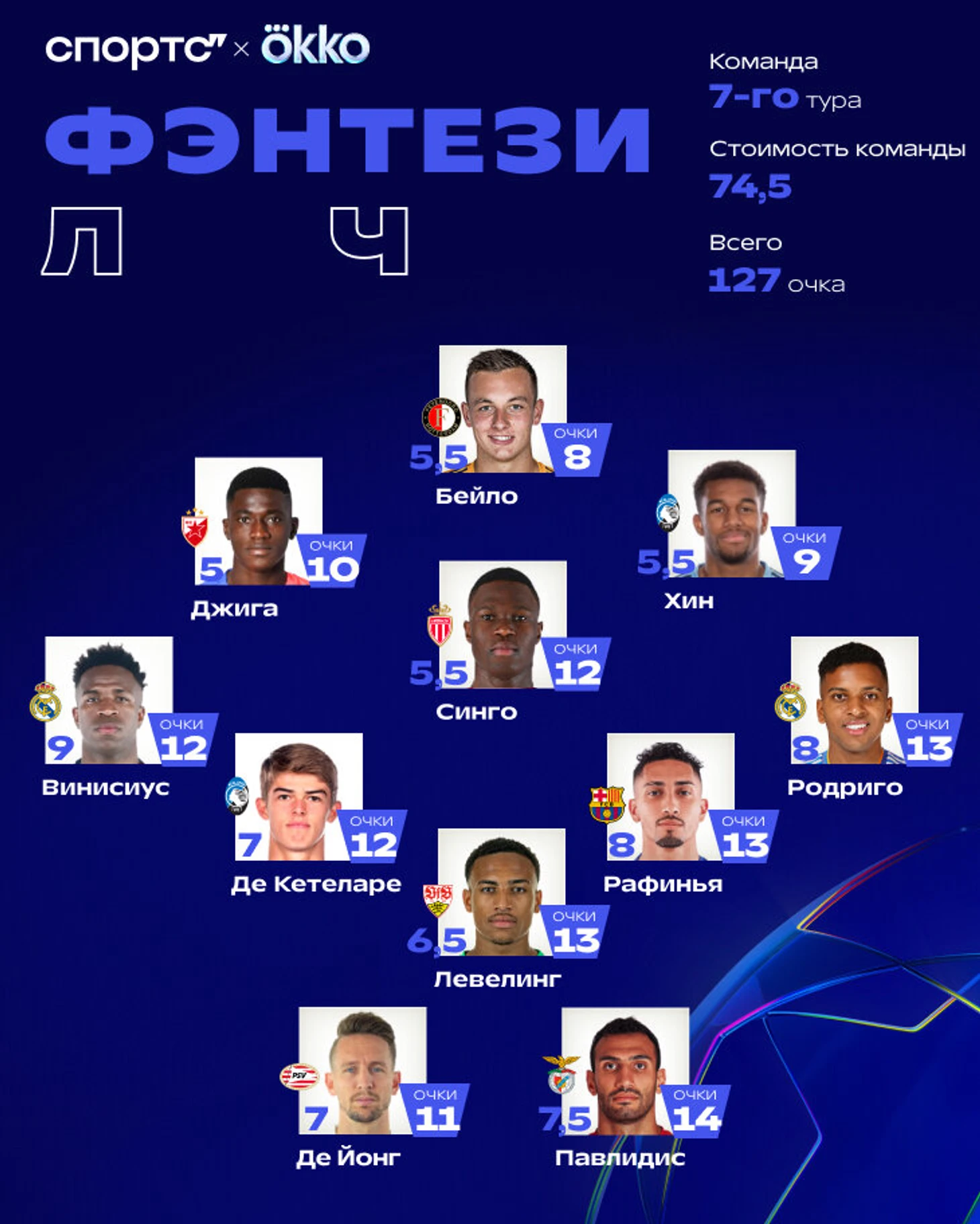 Это самые эффективные игроки 7-го тура в фэнтези ЛЧ на Спортсе. Сборная составлена так: