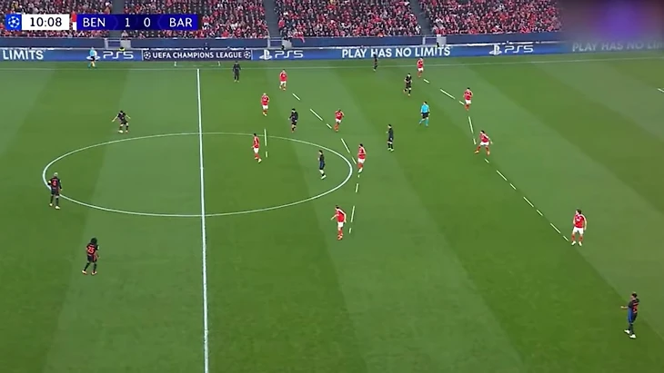 Бенфика забила быстрый гол, но не забилась в автобус, а напротив, успешно прессинговала Барселону и при этом успевала дисциплинированно отскакивать в 4-4-2.
