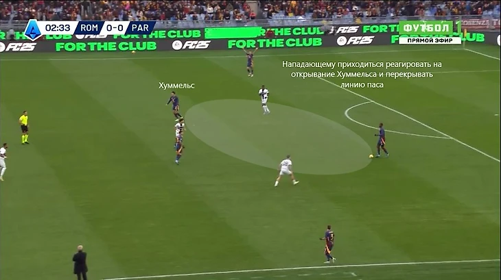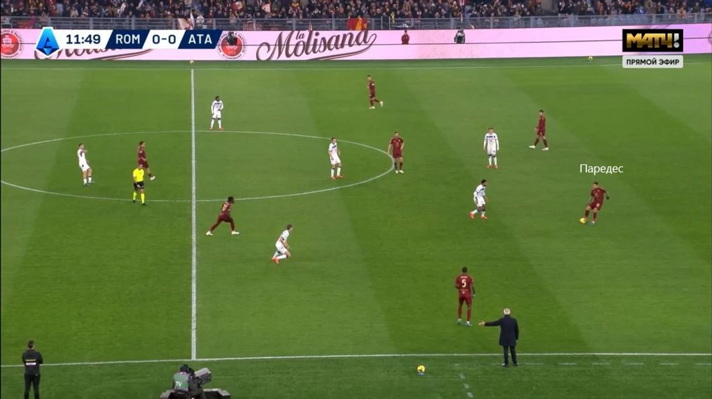 1) В тройку ЦЗ для розыгрыша опускается один из опорников: Паредес, Кристанте или Коне. Один из внешних центральных защитников поднимается выше (скрин 1).