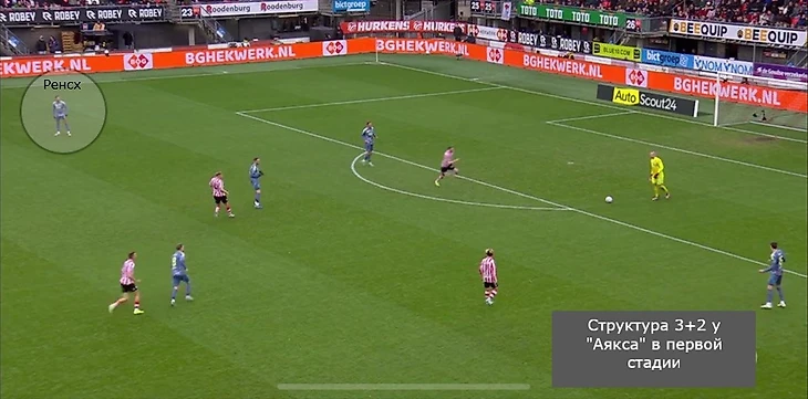 «Аякс» играл 3+2 при выходе из обороны (3 защитника + 2 опорника), Ренсх не поднимался высоко, а играл почти как третий ЦЗ в узкой позиции.
