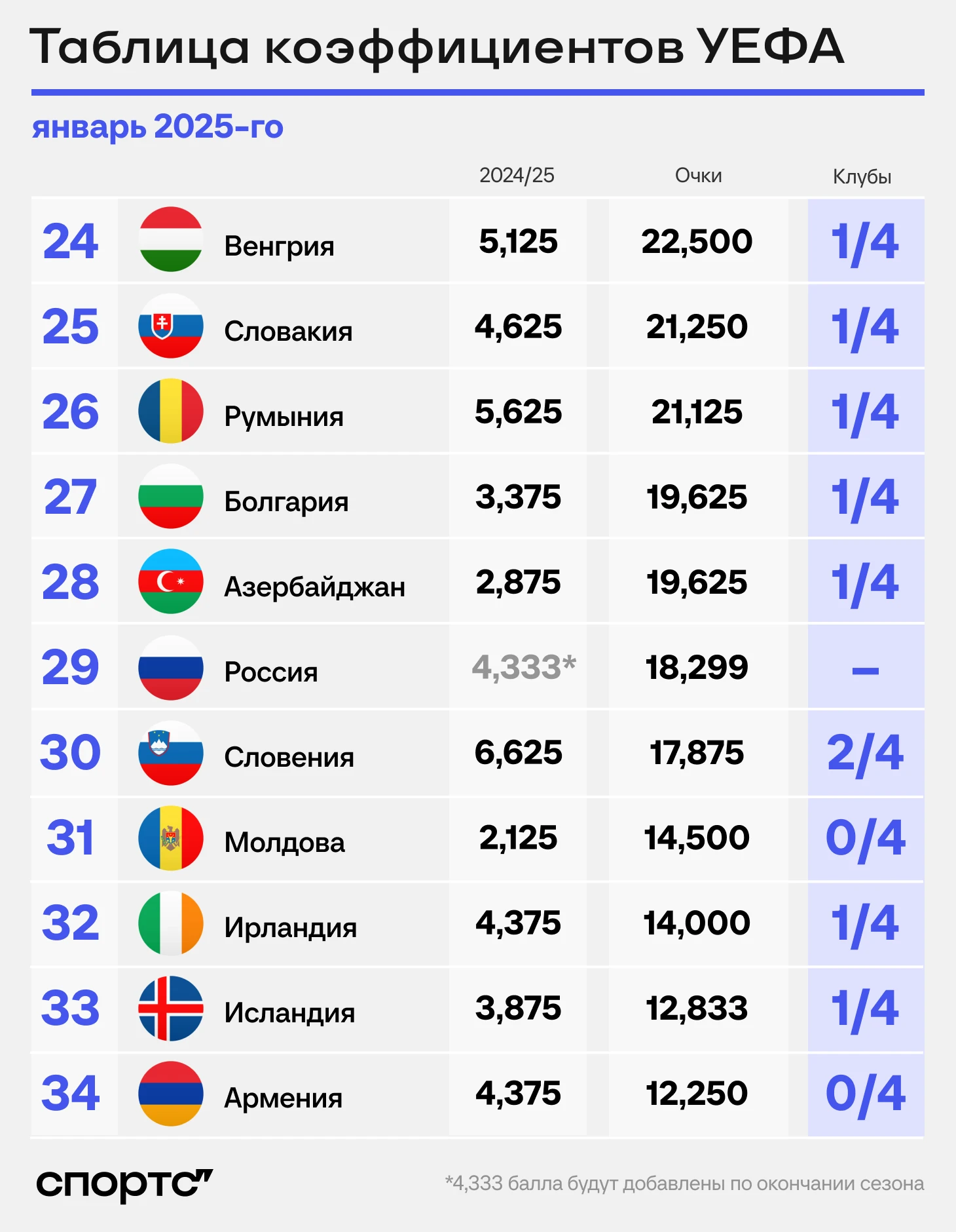 УЕФА обновил таблицу 24 января. У России пока чуть больше 18 баллов.