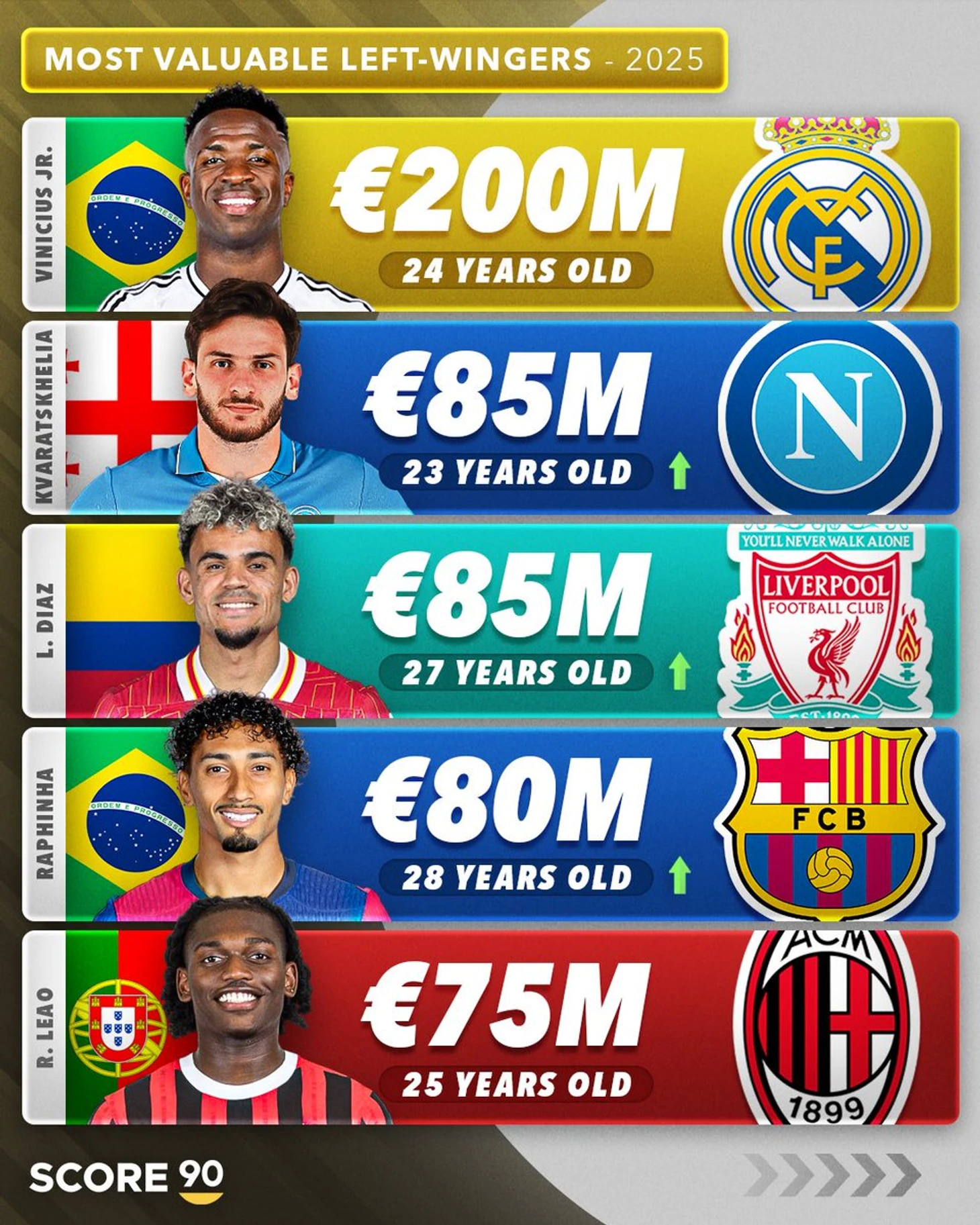 Хотя по данным Transfermarkt, грузинский вингер оценивается аж в 85 млн евро, это делает его вторым самым дорогим левым вингером планеты. Повод взглянуть на всех.