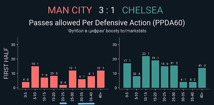 «Синие» достаточно активно начали первую половину достаточно активно, особенно и в плане прессинга (как гол-то пришел, собственно), что показывает график PPDA гостей: