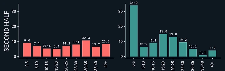 А вот вторая 45-минутка началась куда менее интенсивно со стороны обеих команд, особенно в плане прессинга, ведь в первые 5 минут ни один из коллективов не совершил ни одного оборонительного действия, да и в принципе, по темпу набора xT (опасность передач) первые 15 минут второго тайма худшие в матче.