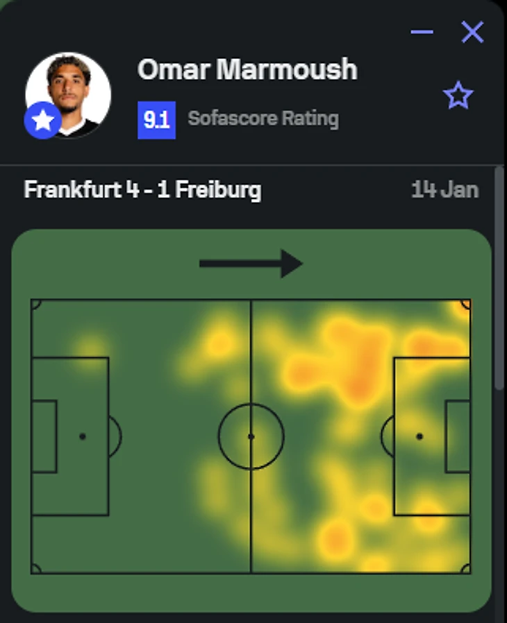 В первой половине сразу стало ясно (и это было достаточно очевидно), что Мармуш и близко не получит той свободы действий, которая была у него в «Айнтрахте», а по позиции и роли он будет приближен к Де Брюйне, пусть и с возможностью подниматься выше в двойку форвардов: