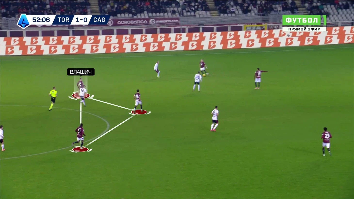 Ключевой элемент формации – свободный Никола Влашич. Хорват буквально склеивает команду и схему. Он стартует около нападающего Че Адамса, но на практике постоянно занимается созданием треугольников. Это может быть фланговый треугольник справа: