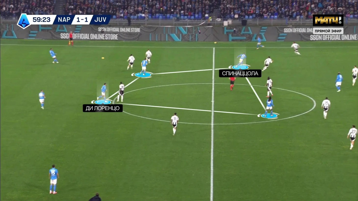 Интересный элемент – роли крайних защитников. Джованни Ди Лоренцо и Леонардо Спинаццола помогали контролировать центр поля, свободно занимая позиции в этой зоне. Они действовали настолько вольно, что закралось подозрение, что Антонио Конте на досуге посматривал «Тоттенхэм» Постекоглу (лучших времен, разумеется). В ширине действовали вингеры Маттео Политано и Давид Нерес.