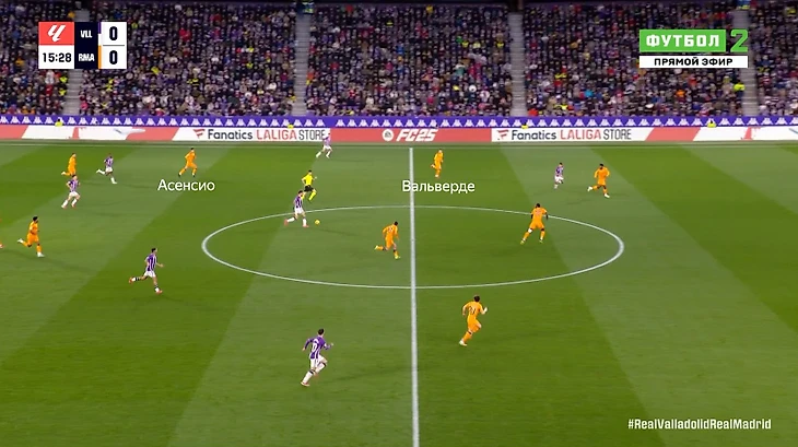 Внимательность Феде не позволила «Вальядолиду» разорвать фланг. Рауль благополучно вернулся и отобрал мяч в зоне перед штрафной.