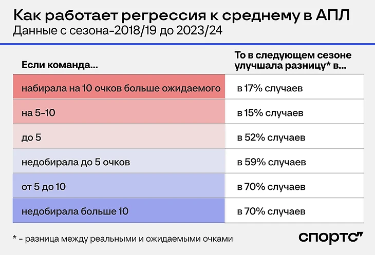 Тот же «Брайтон» в сезоне-2020/21 недобрал 20 очков. В следующем сезоне недобрал всего 3 очка. Регрессия к среднему.