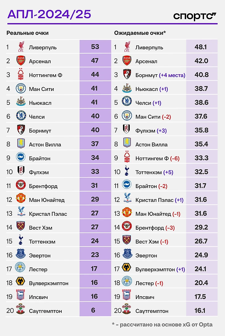Вообще, сезон – не такая большая дистанция, на которой может случиться всякое. Стандартная разница между реальными очками и ожидаемыми в рамках одного розыгрыша АПЛ – 8 очков. Это значит, что среднестатистическая команда может финишировать в диапазоне от еврокубковой зоны до десятого места.