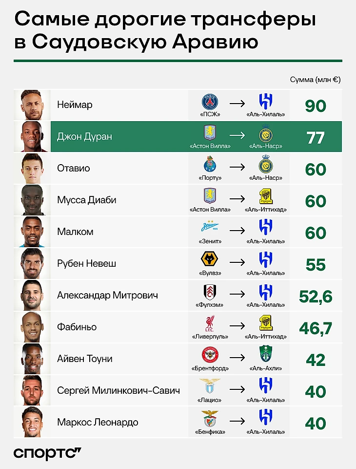 Английская Премьер-лига – любимое место шопинга саудовских клубов. Вместе с трансфером Дурана общая сумма трат на футболистов английских команд приблизилась к 600 млн евро. Для сравнения: на втором месте французская Лига 1 с 220 млн евро – из которых почти половина это переход Неймара.
