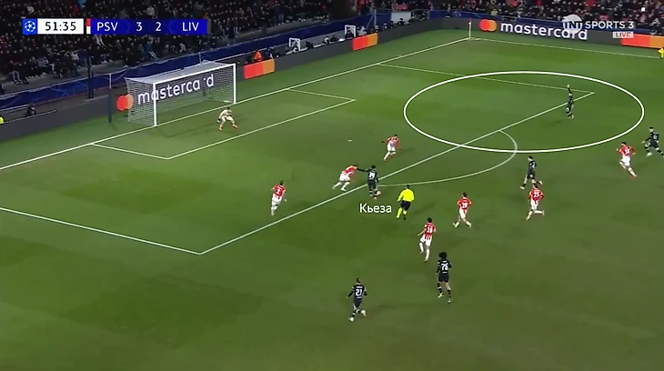 Еще «Ливерпуль» допускал свободу между линиями. Ватару Эндо приходилось покрывать огромную зону по всей ширине, поэтому опорник ожидаемо успевал не во всех эпизодах. Разрывы возникали и в прессинге: одна из фланговых ловушек не прошла после передачи в центр (Эллиот вовремя не сместился ближе к флангу).