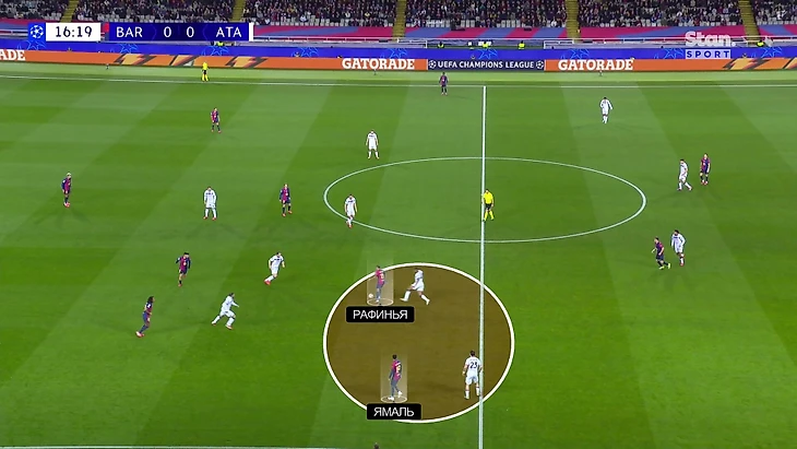 И так буквально в каждом розыгрыше. В первом тайме все работало. «Аталанта» не очень часто отбирала мяч давлением, но здорово сковывала возможности «Барсы». Каталонцы пытались путать соперника сменой позиций – например, собирали Рафинью и Ламина Ямаля в одной зоне, но «Аталанта» справлялась через передачу оппонентов и плотное доигрывание. Провалов не возникало: