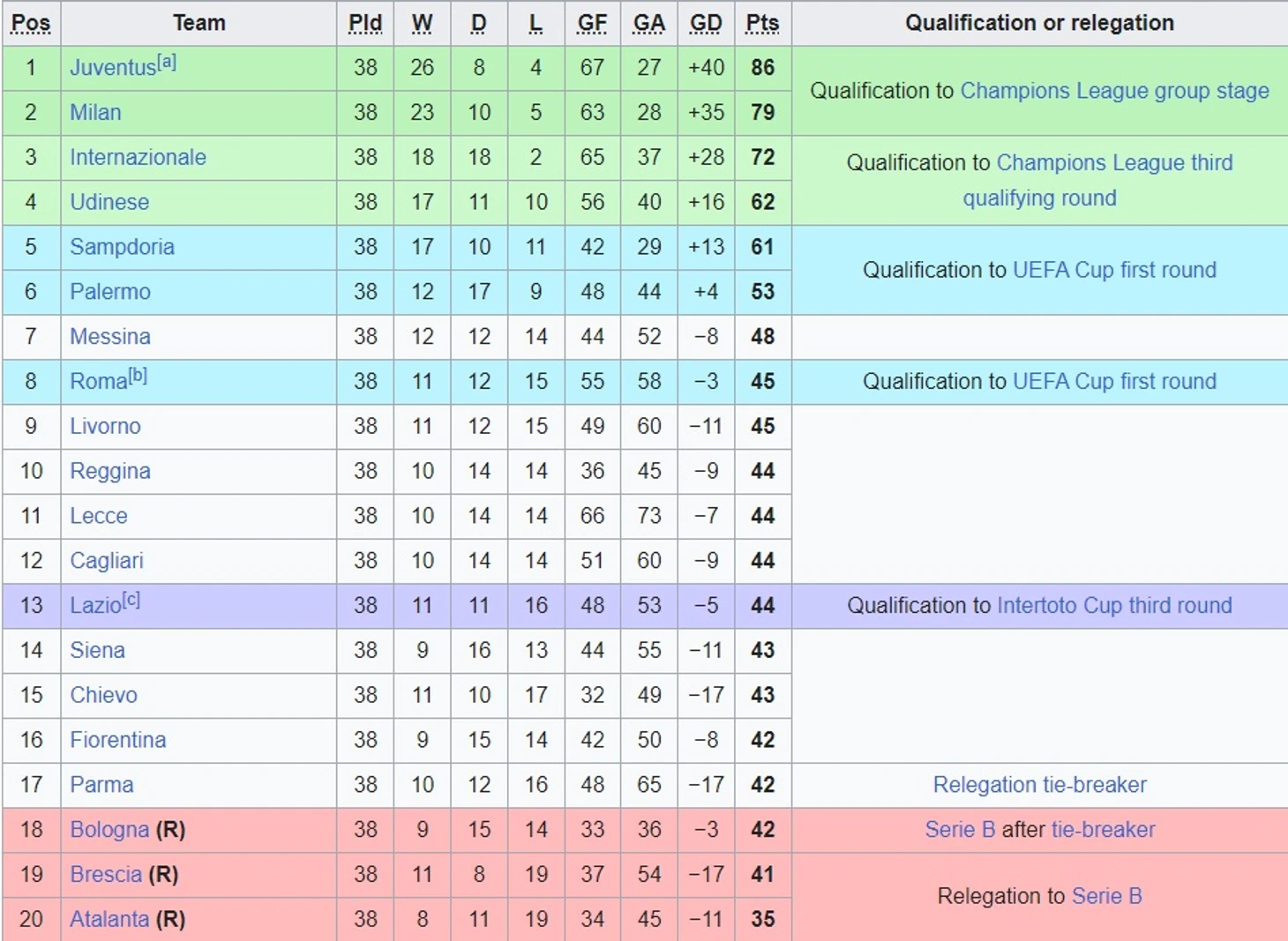 Итоговая таблица сезона 2004/05 поражала своей плотностью – разница между 8-м и 19-м местами составила всего 4 очка. «Лацио» финишировал на тринадцатом месте, в двух баллах от зоны вылета. Клуб, который несколько лет назад брал Скудетто, завершал сезон договорняком, чтобы не вылететь. Великий «Лацио» официально канул в лету.