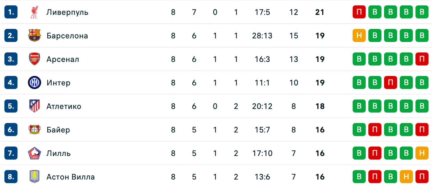 Таким образом, «Ливерпуль» набрал за групповой этап 21 очко, заняв первое место, забил 17 голов и пропустил пять мячей. Из тех команд, с которыми встречались «красные» на этом этапе ЛЧ, напрямую в 1/8 прошли только «Байер» и «Лилль» с шестого и седьмого мест, соответственно.