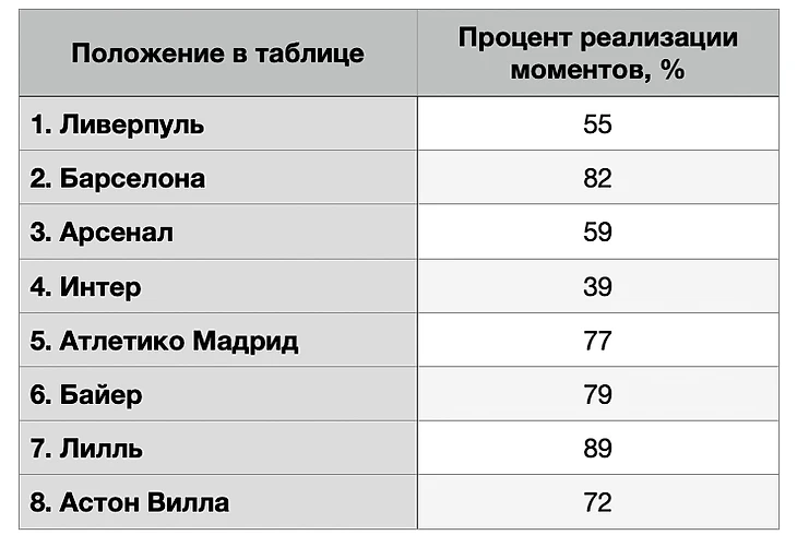 Таким образом, среди команд первой восьмерки при не самом высоком проценте реализации моментов, «Ливерпуль» в групповом этапе занял первое место.