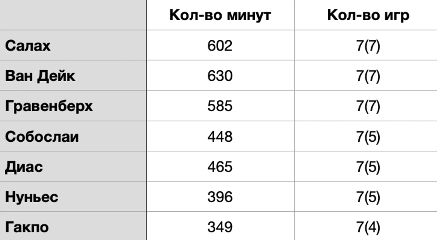 Среди футболистов «красных» нет ни одного игрока, который отыграл бы во всех восьми турах. В семи матчах сыграли Салах, Гакпо, Нуньес, Диас, Собослаи, Гравенберх и Ван Дейк. При этом в упомянутых семи встречах с первых минут играли только Ван Дейк, Салах и Гравенберх. Собослаи, Диас и Нуньес вышли в старте в пяти из семи играх, Гакпо – в четырех.