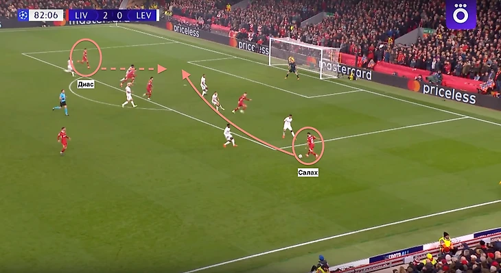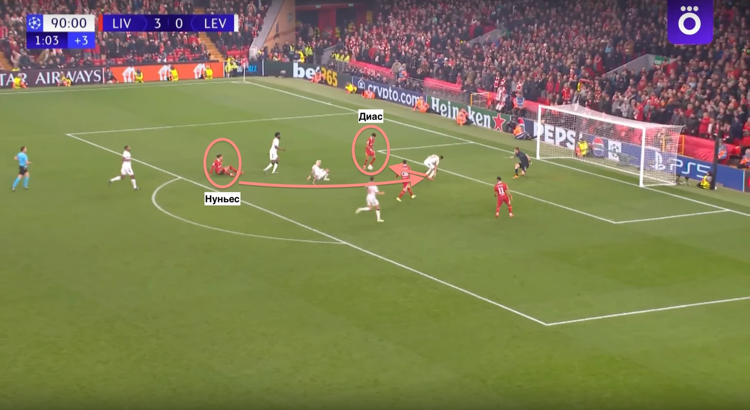 Свой третий гол в этой встрече Диас забил уже в добавленное время. Контратака «Ливерпуля» грозила закончиться ударом Нуньеса по воротам, но Дарвин попал в защитника «Байера». Диас, тем временем, поддерживал атаку слева, в результате чего, мяч отскочил прямо ему в ноги. Последовал удар и 4:0 на табло.