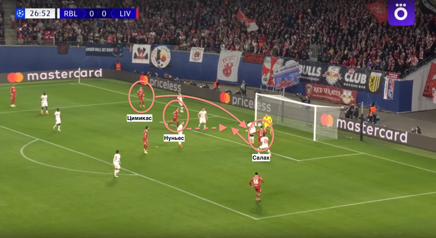 Следующее результативное действие в третьем туре в гостях у «Лейпцига» (0:1). Голевой пас после подачи Цимикаса с левого фланга. Салах головой скинул мяч на дальнюю штангу, куда за спиной защитника вбежал Нуньес и занес в ворота. Второй матч подряд стопроцентный вклад египтянина в результат встречи. Что касается Нуньеса, то это его единственный гол на групповом этапе ЛЧ в этом сезоне.
