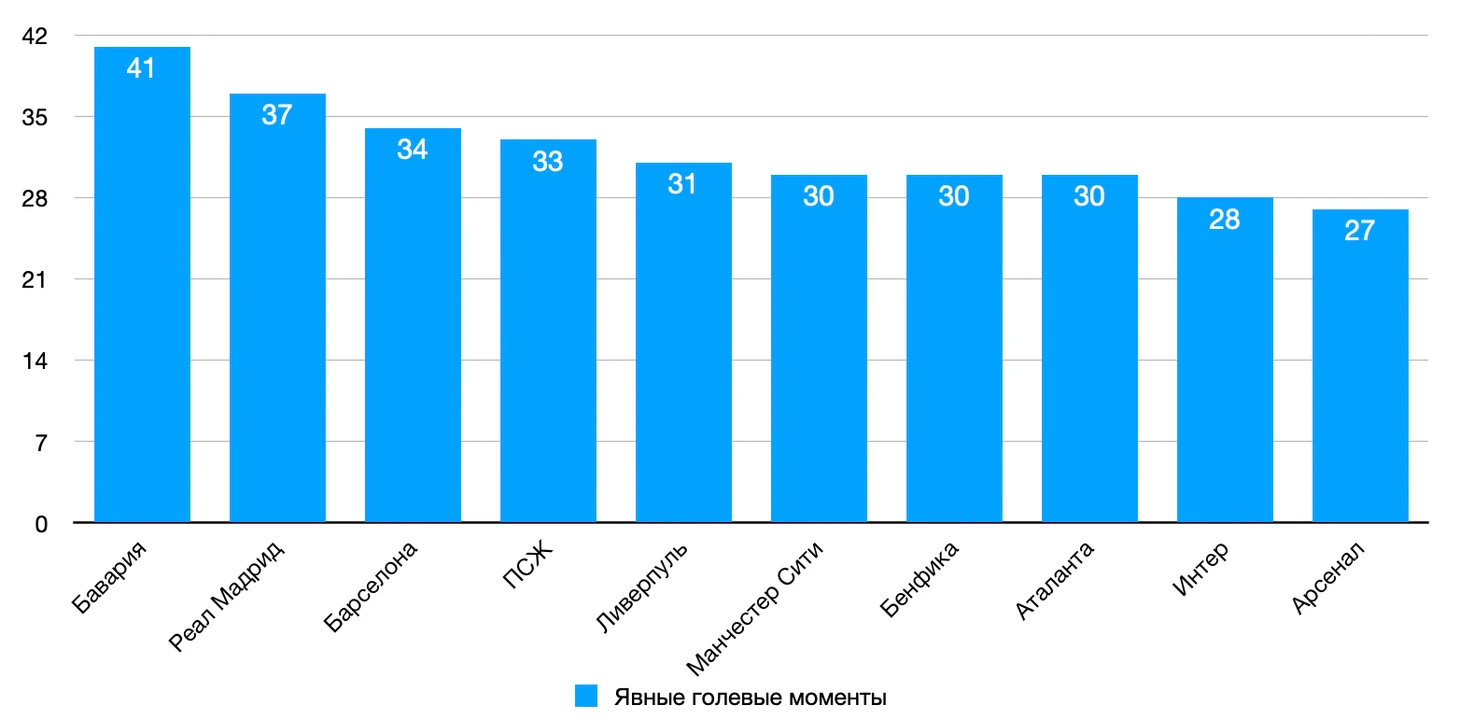 Что касается созданных голевых моментов, «Ливерпуль» занимает пятое место, создав 31 большой шанс. Для сравнения показатели остальных команд: