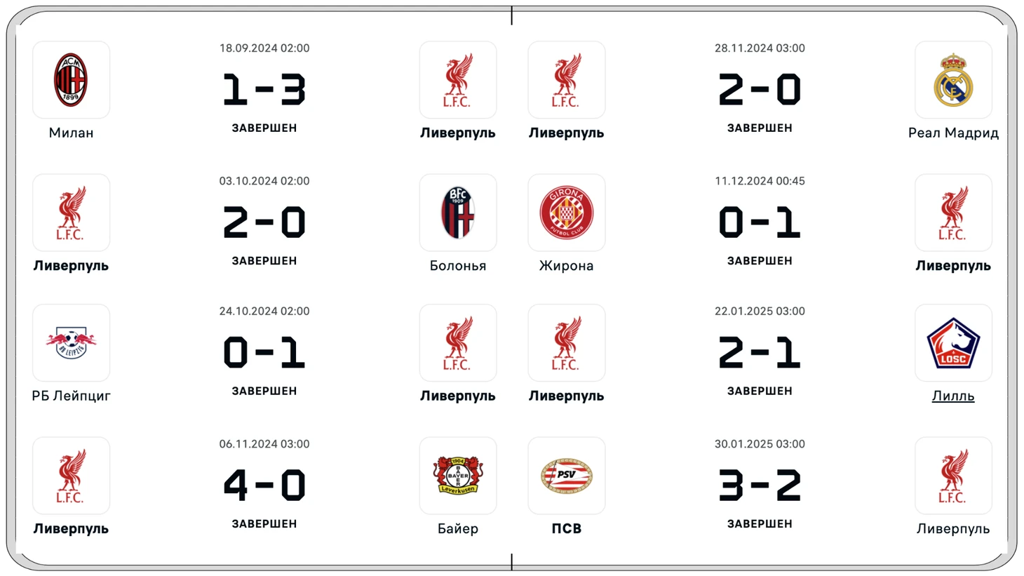 В седьмом туре французский «Лилль» приехал в гости на «Энфилд», но уехал с одним забитым и двумя пропущенными голами. И заключительный восьмой тур Арне Слот в высшей степени использовал для ротации состава, дав игрокам с малым количеством минут и заявленной молодежи возможность проявить себя, а футболистам старта предоставил отдых. Отсюда и результат 3:2 в пользу бывшего клуба Коди Гакпо.