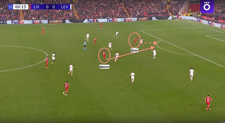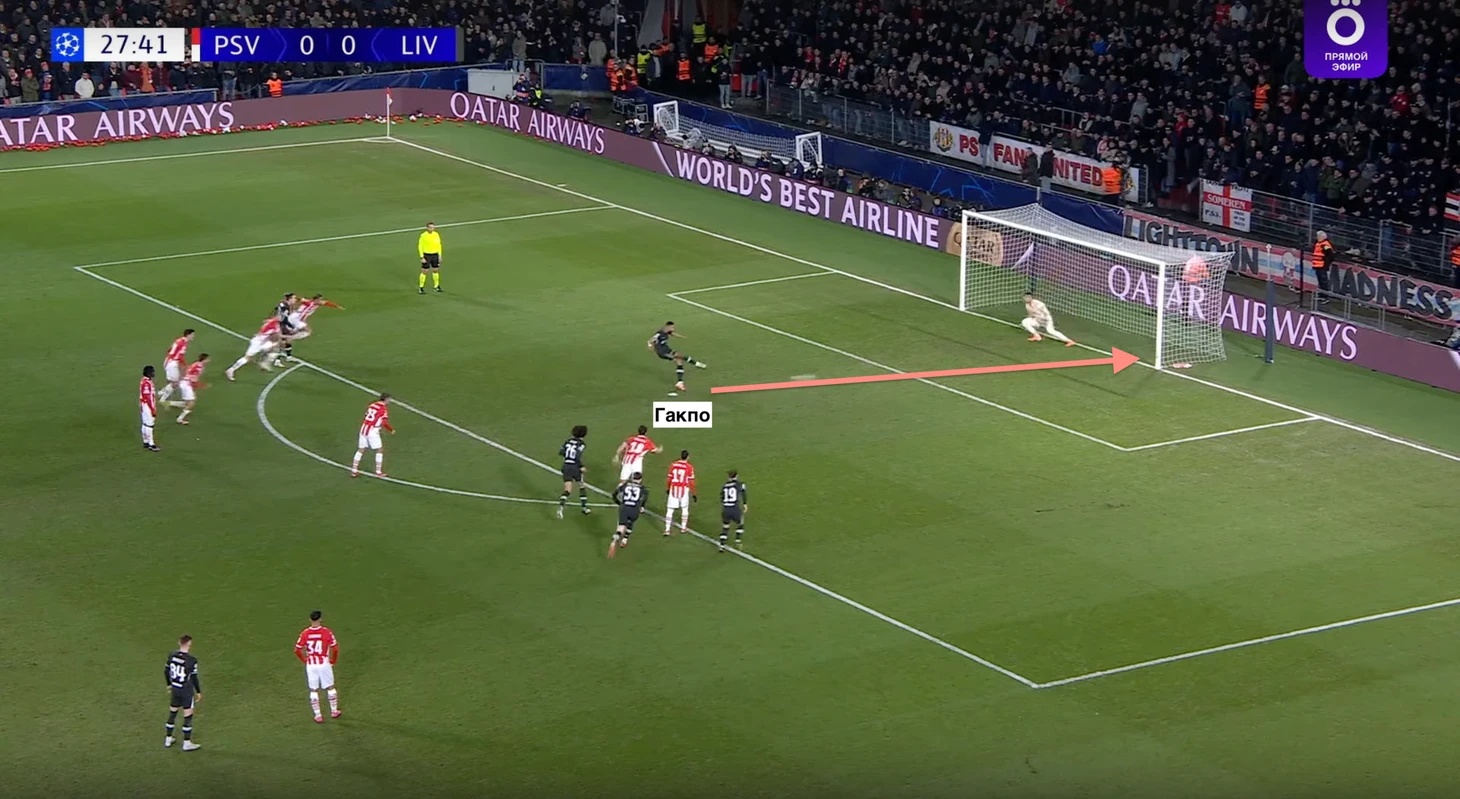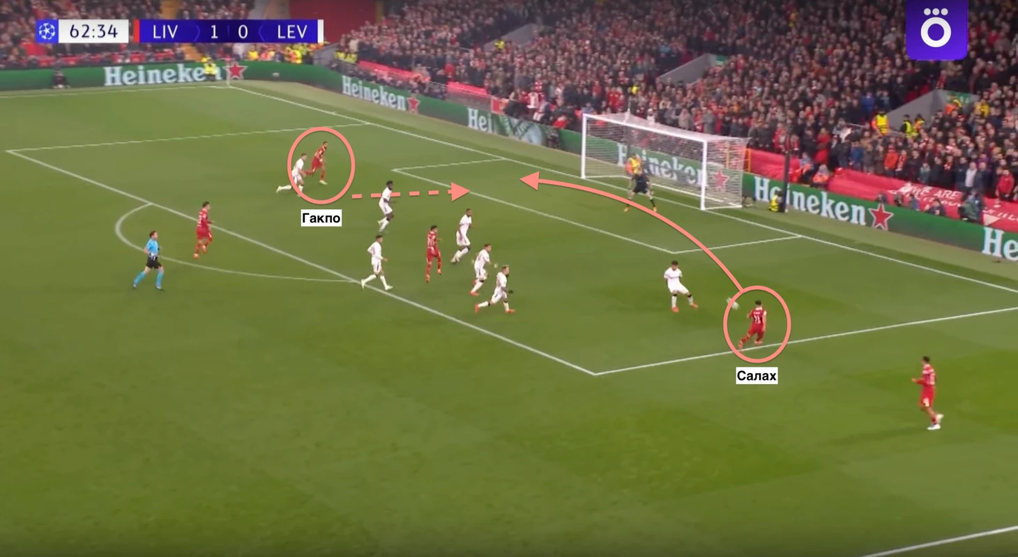 Далее подробнее рассмотрим результативные действия Гакпо и Диаса, которые вместе с Салахом по итогам группового этапа являются лучшими бомбардирами команды. Их голы мы уже затронули в матче с «Байером» (4:0), но не рассмотрели остальные два гола Луиса Диаса, который оформил хет-трик в этой встрече.