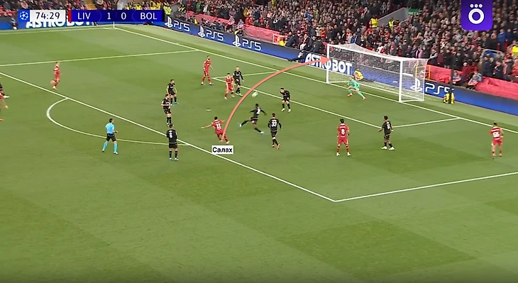 Следующее результативное действие в этой же встрече, но уже в качестве забитого гола. После передачи от Собослаи, Мо сместился в середину и своей рабочей левой ногой отправил мяч в дальний угол ворот. Таким образом, 1+1 против «Болоньи».
