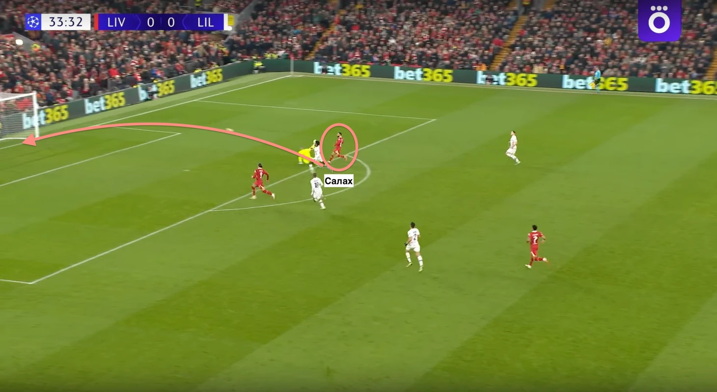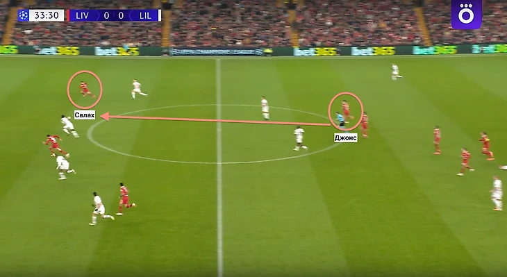 После отбора Цимикаса, Кертис Джонс оказался первым на подборе и одной разрезающей передачей по центру отправил Салаха один на один против вратаря «Лилля». Мо спокойно реализовал момент, открыв счет встречи.