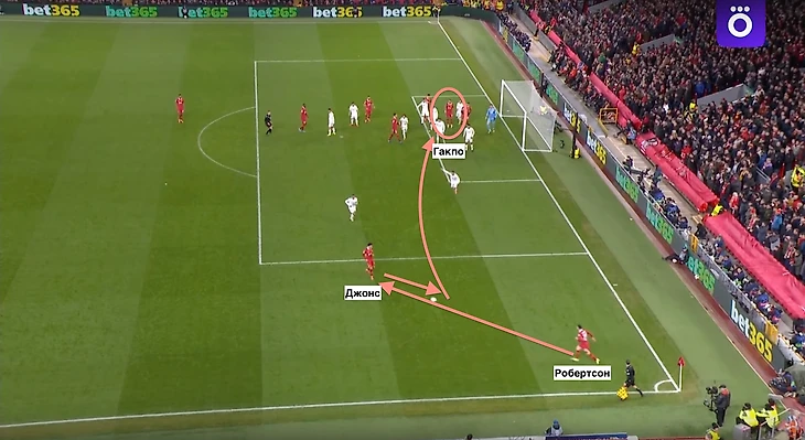 Роберстон коротким розыгрышем вводит мяч в игру и через возврат мяча от Кертиса Джонса делает навес во вратарскую зону прямо на голову Гакпо.
