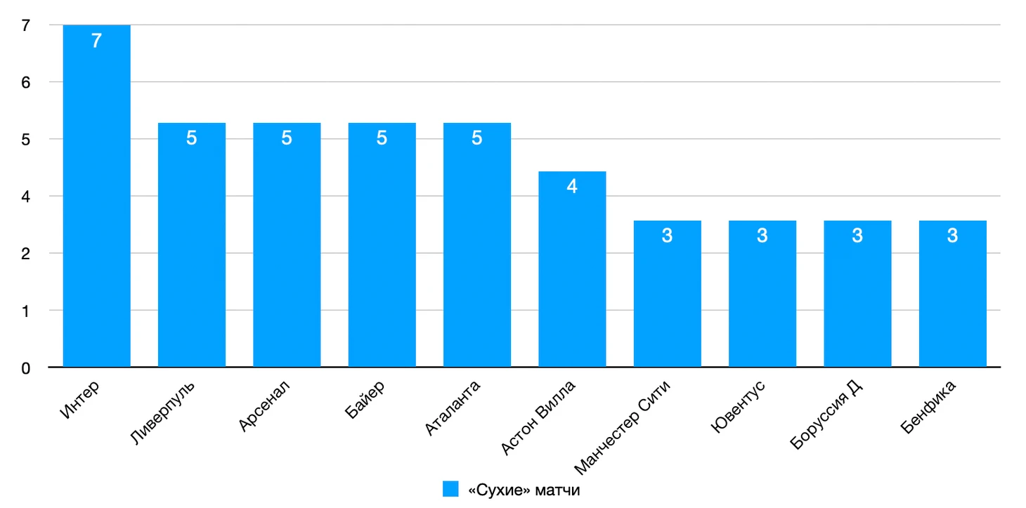 По количеству «сухих» матчей «Ливерпуль», на ряду с «Арсеналом», «Байером» и «Аталантой», имеет в активе пять из восьми таких игр. Действия в обороне таких команд стоят комплиментов. Для сравнения показатели остальных клубов: