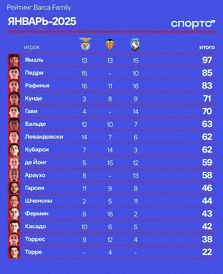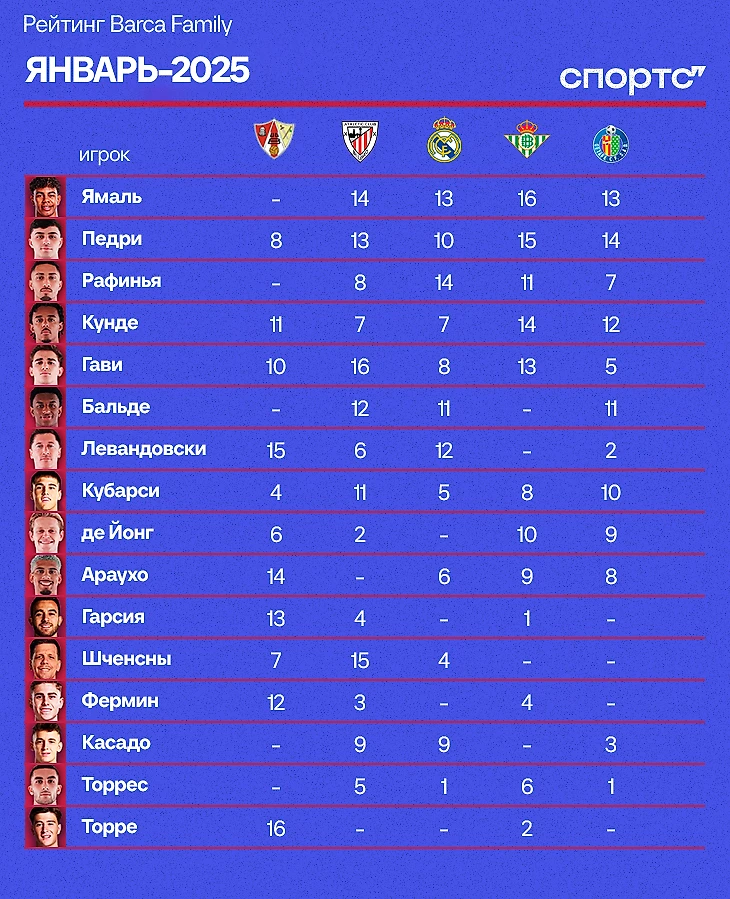 Ламин Ямаль стал лучшим игроком января. Он пропустил первый матч кубка против «Барбастро», но затем регулярно выходил на поле и делал разницу на фланге. Ламин забивал в двух матчах Суперкубка, в матче кубка против «Бетиса» и в матче лиги чемпионов против «Аталанты». В добавок к этому у вингера еще два ассиста.