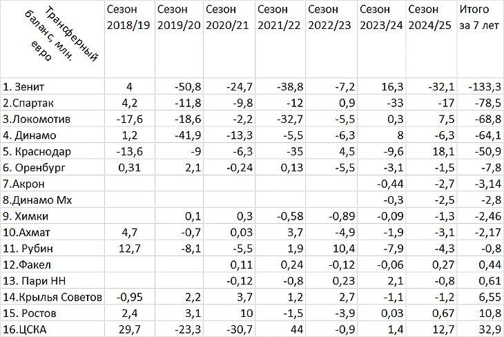Другие же клубы заняты либо борьбой за возвращение хотя бы на сборы своих легионеров (Динамо - за Бителло, Ростов - за Саравию), либо пытаются продать «за дорого» числящихся в составе игроков, на место которых есть клиенты своих агентов (Локомотив - Сельянова и Тикнизяна). А уж попытки одного из ЮТуб каналов ( ЭФБ) называть «резонансными» бесплатные переходы беспросветных «лавочников» Динамо и Краснодара в Нижний Новгород воспринимаются адекватными людьми как попытка пробудить хоть какой-то интерес к кому то, кроме СБГ и КБ. До нынешней зимы такого не было в РПЛ никогда в последние лет 10-15, поэтому и возник интерес посмотреть на трансферные балансы Зенита и Спартака за последние сезоны (после 24.02.2022г), и сравнить с расходами других команд РПЛ, чтобы убедится в справедливости вывода. Вот таблица по клубам за это время с Трансфермаркта: