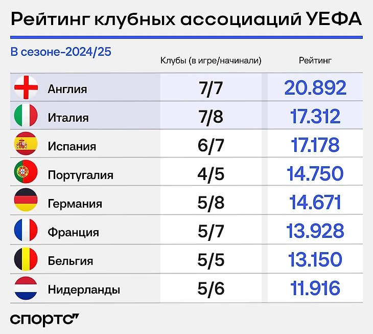 В этом году Англия пока уверенно лидирует: не потеряли ни одного клуба. Все, кроме «Сити», финишировали в топ-8 своих турниров – за это полагаются дополнительные бонусы. Отрыв серьезный, но пока ничего не решено.