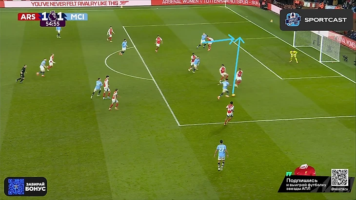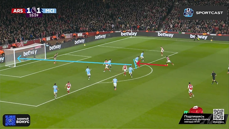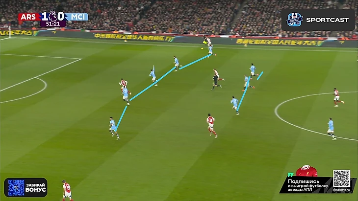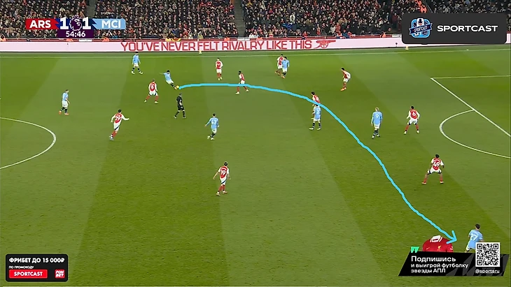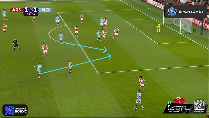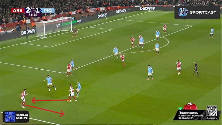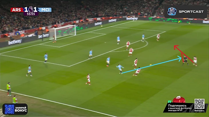 3) Пройдемся и по оборонительным аспектам: Савиньо также помогал в обороне и сдваивал правый фланг «Арсенала», на который у «канониров» даже без Сака, в основном, нацелен билд-ап, вернее был нацелен в предыдущих матчей, ведь сегодня этот крен куда-то резко пропал, и хозяева атаковали очень сбалансированно, однако при удобном случае бразилец туда все равно опускался, причем вполне успешно: