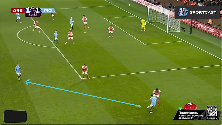 Здесь в очередной раз стоит сказать, что Фоден - не правый вингер, и любая позиция справа для него неудобна. Этот пас, который перехватил Парти, по-моему вообще не имел конкретного адресата, ведь ни Холланда, ни Мармуша по близости не было, а значит в лучшем случае мяч бы просто выкатился в аут или был бы подобран у самой боковой ленточки.