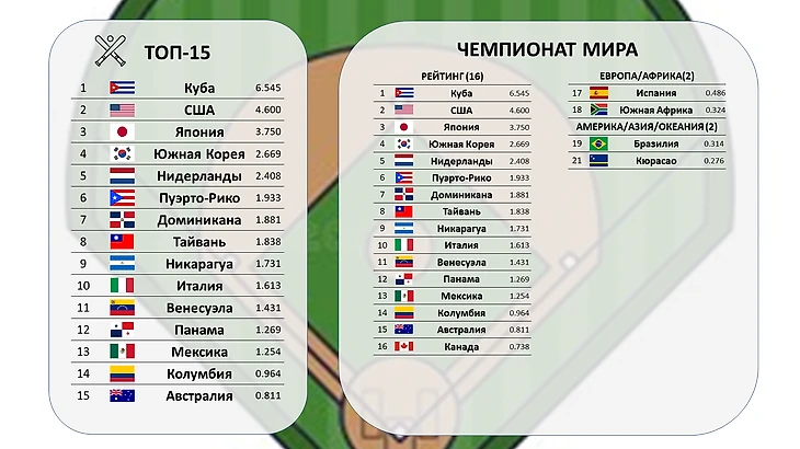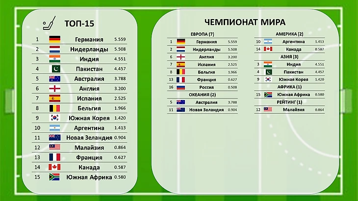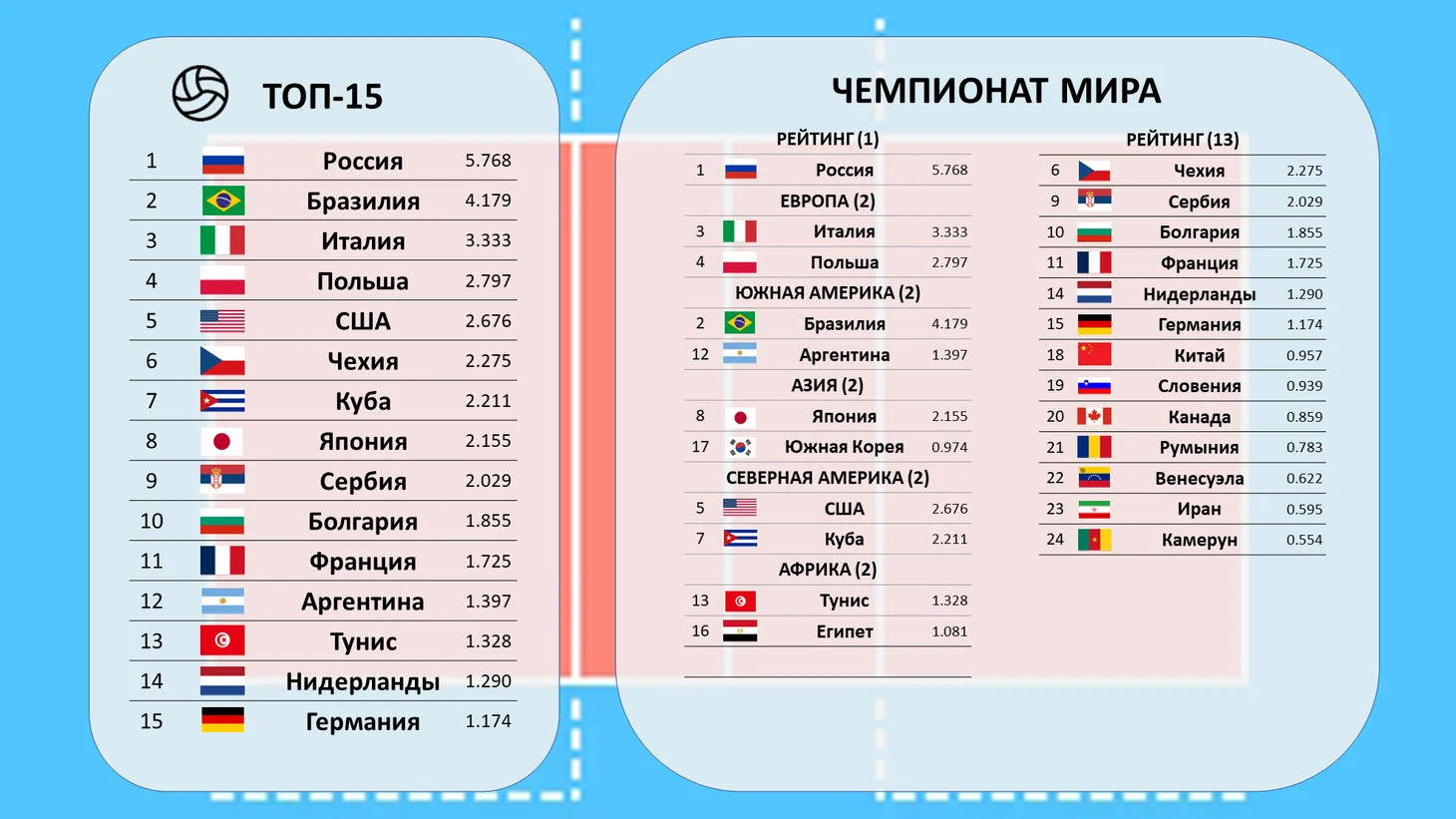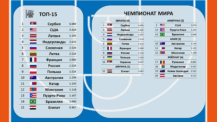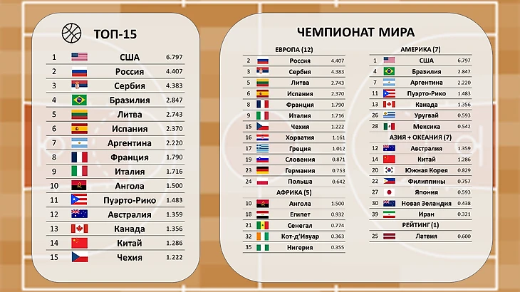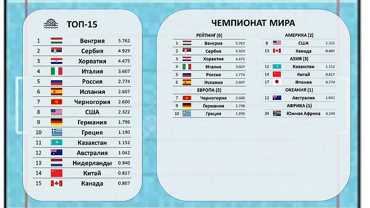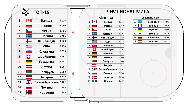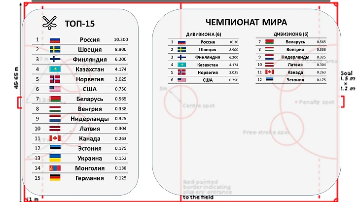 После сбора данных по всем турнирам одной дисциплины я высчитывал рейтинг силы сборных (привожу топ-15), а также моделировал список участников чемпионата мира. Для брал формулу отбора как в последнем турнире (количество участников, сколько отбирается из каждой конференции и т.д.), слоты хозяев по общему правилу занимает лучшая команда по рейтингу среди не квалифицированных на чемпионат.