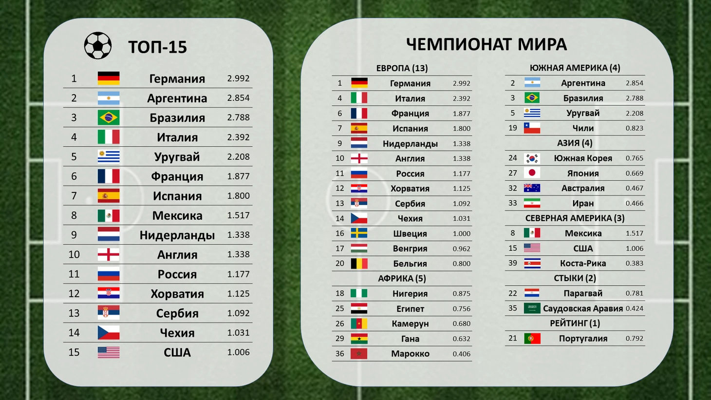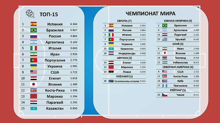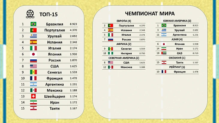 С огромным отрывом лидирует Бразилия, также сильна Португалия. Из Африки выделяется Сенегал, а в Азии – Япония. Также отмечу крепкую сборную Таити.