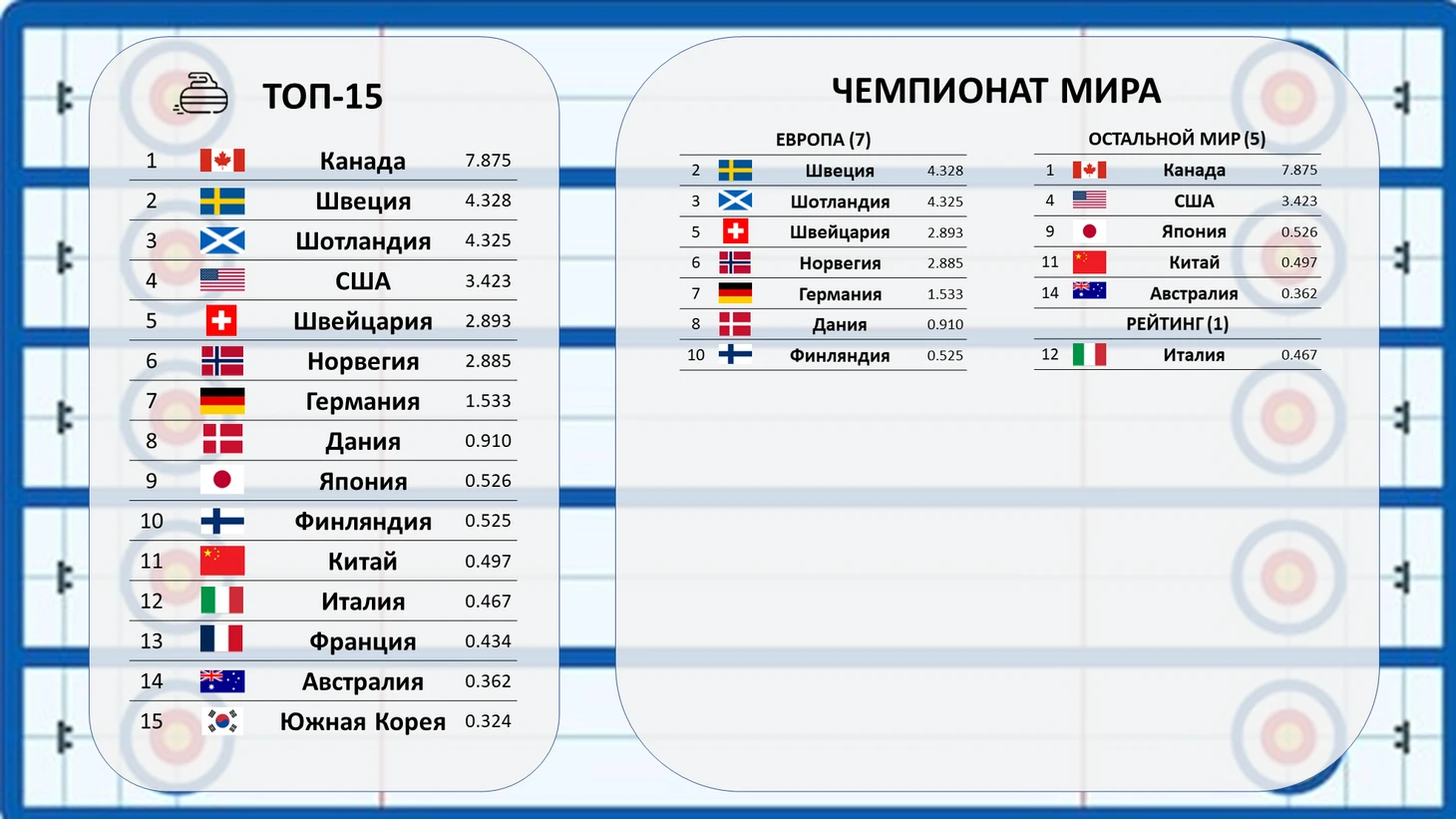 Уверенно лидирует Канада, далее Швеция и Шотландия. В целом (как и в хоккее) сильны северные страны + Япония.