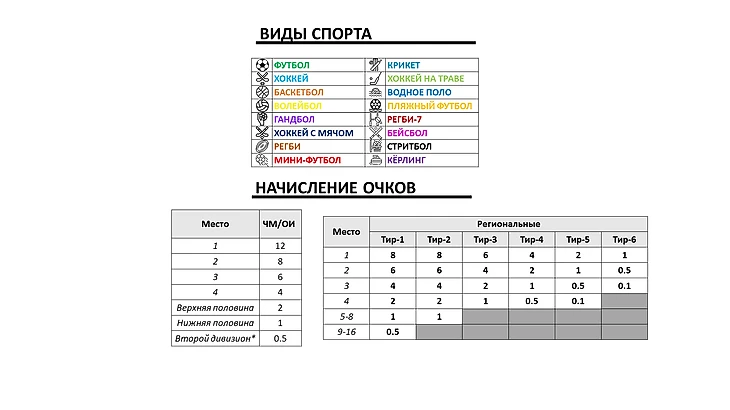 а эта матрица одинаковая для всех видов? Просто в мужском футболе ОИ это фактически молодежный турнир, по значимости сильно уступающий и ЧМ, и ЧЕ, да и Лиге наций.