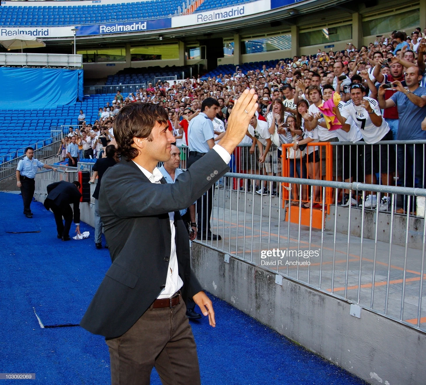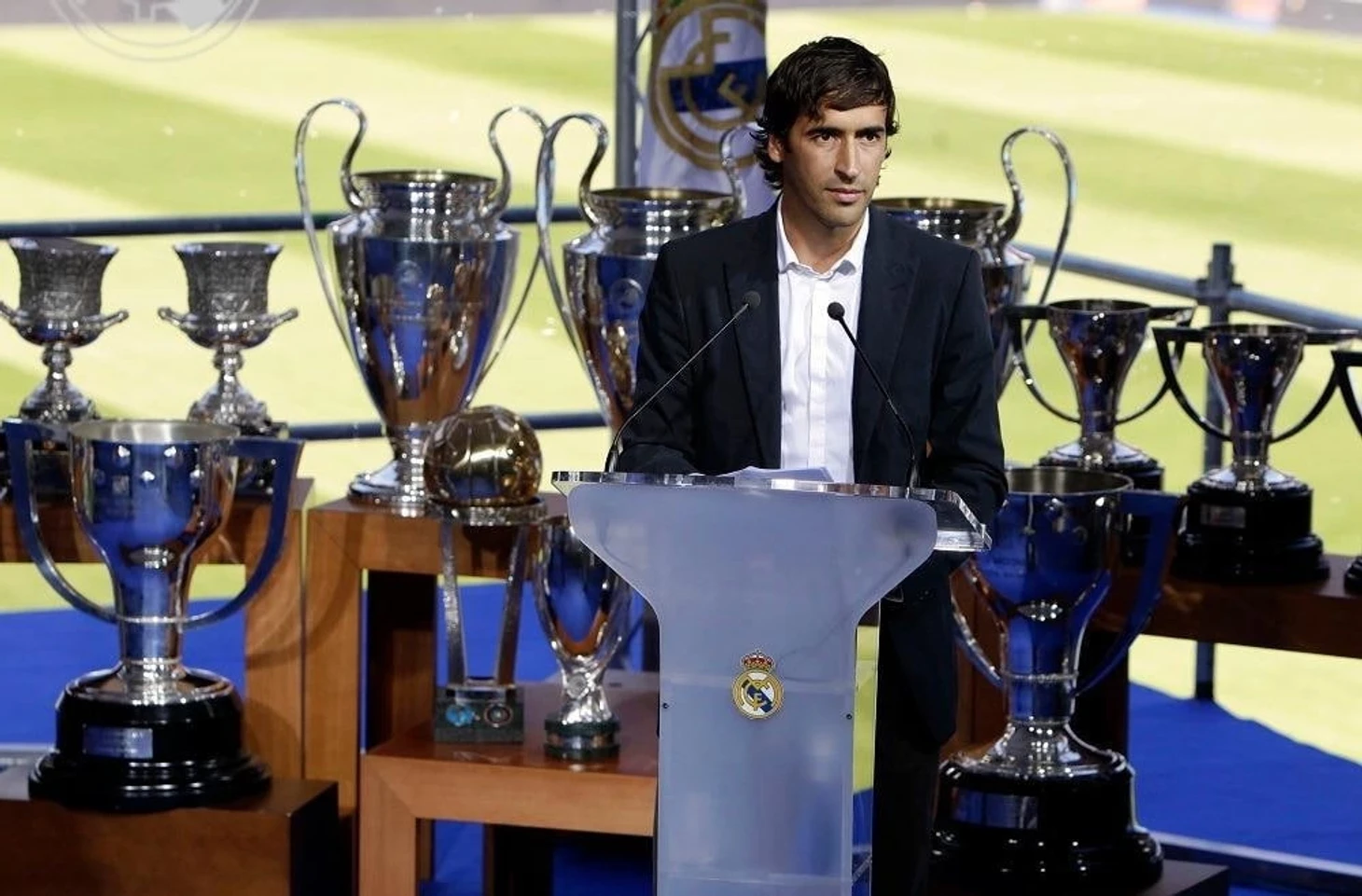 Его сопровождал Флорентино Перес, более привычный к такому типу мероприятий, хотя также явно взволнованный. Президент был тем, кто открыл выступление словами: «Сегодня мы переживем волнующий момент. Есть много людей, которые оставили свой след в этом клубе. Многим удалось завоевать славу и уважение, но немногие из них достигли таких высот. Рауль заслужил своей работой и усилиями преданность «Мадрида» и всех его соперников. Его требовательность к себе и постоянные усилия выходят за рамки логики. На поле и за его пределами он разделяет все ценности, которыми пропитан «Реал Мадрид». Он пример. Нелегко выиграть все, что он выиграл. Он завоевал миллионы поклонников. Рауль – капитан и хозяин своей судьбы. Он решил завершить этот этап, но мы не говорим «прощай», а говорим «до встречи». Где бы ты ни был, футболка «Реала» всегда будет твоей футболкой. Стадион «Бернабеу» останется твоим домом. Мы тебя не забудем». Рауль ждал в нескольких метрах позади и слушал, сглатывая слюну и сдерживая слезы, слова признания президента.